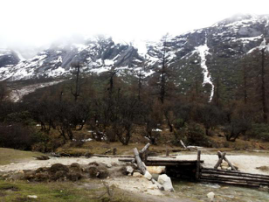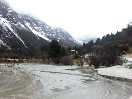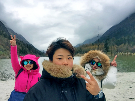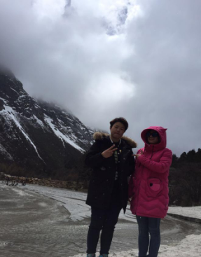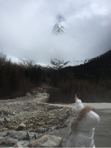 從景區門口到第一個景點相距20多公里,共33個急彎道,乘坐觀光大巴上去,司機大叔的車技了得,被我們戲稱為“秋名山車神”。可是盡管“車神”車技了得,那33道急彎的威力依然不容小覷,毫無懸念的,我們的小伙伴部分暈車了。所幸,不嚴重。下車,到達景區,看到大雪山的那一刻便激動了,于是開啟了我們拍拍拍的模式,一路走一路拍,上山的路上飄著小雪。