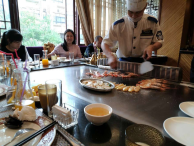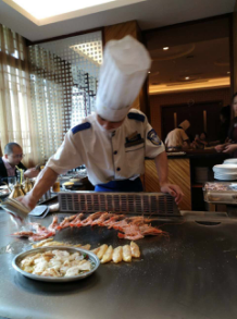 都說(shuō)“舌尖上的幸福來(lái)自于美食的滋養(yǎng)”。今天的午餐,是我們這群吃貨的盛宴,豐盛的美食簡(jiǎn)直讓人垂涎欲滴。海鮮的鮮美,肉類的焦香,聽(tīng)著油脂滋滋作響的聲音,看著廚師嫻熟的燒烤手藝,吃著美味的烤肉,大家都興奮的回憶著小時(shí)候約著一群小伙伴在田野里燒烤的場(chǎng)景,雖然食物烤的焦黑了,但在當(dāng)時(shí),還是覺(jué)得非常美味。美食總會(huì)令人感到幸福,在幸福感爆棚的氛圍中,大家一聊就停不下來(lái),最后想到要看廚師表演“焰火冰淇淋”的時(shí)候,服務(wù)員很遺憾的告知我們廚師已經(jīng)下班很久了。