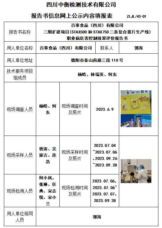 百事食品(四川)有限公司 二期擴建項目(STAX500和STAX750二條復合薯片生產線) 職業病危害控制效果評價報告書