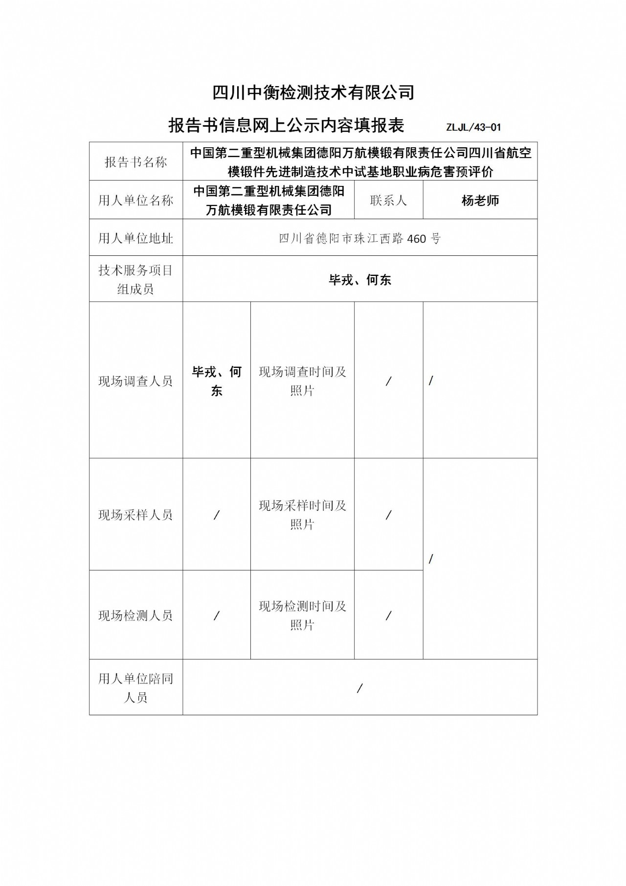中國第二重型機械集團德陽萬航模鍛有限責任公司四川省航空模鍛件先進制造技術中試基地職業病危害預評價