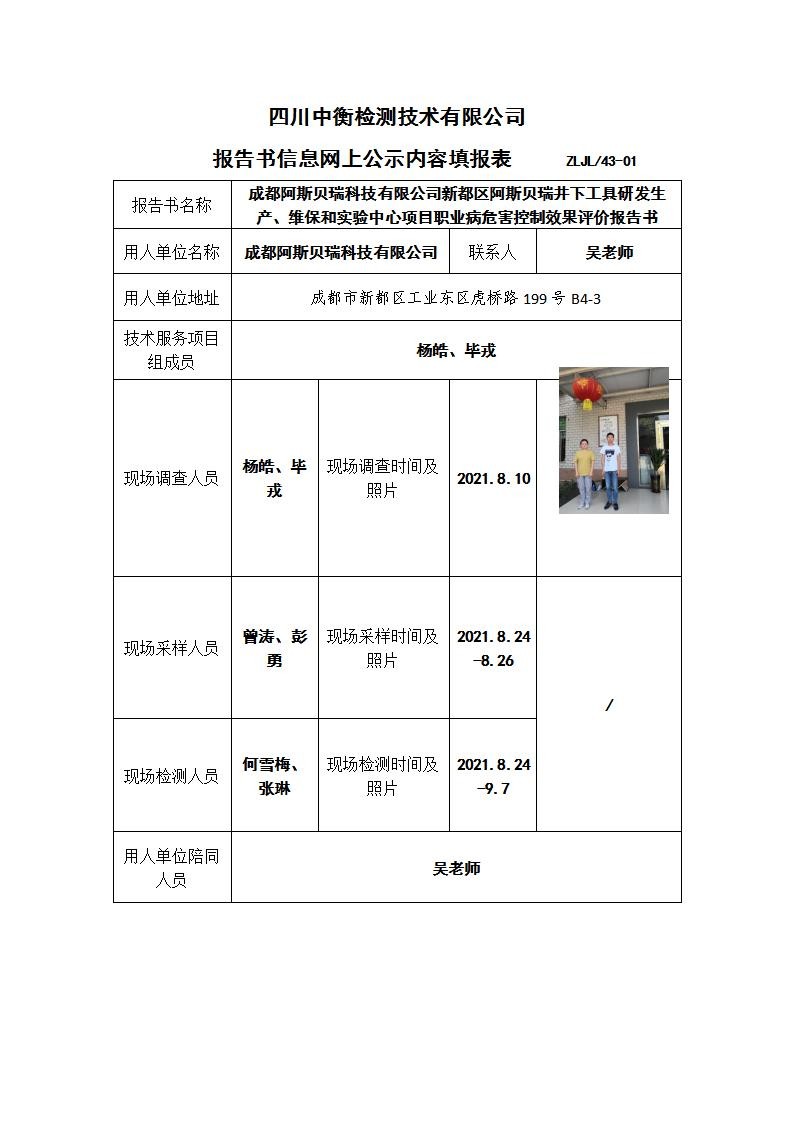 成都阿斯貝瑞科技有限公司新都區(qū)阿斯貝瑞井下工具研發(fā)生產(chǎn)、維保和實(shí)驗(yàn)中心項(xiàng)目職業(yè)病危害控制效果評(píng)價(jià)報(bào)告書(shū)