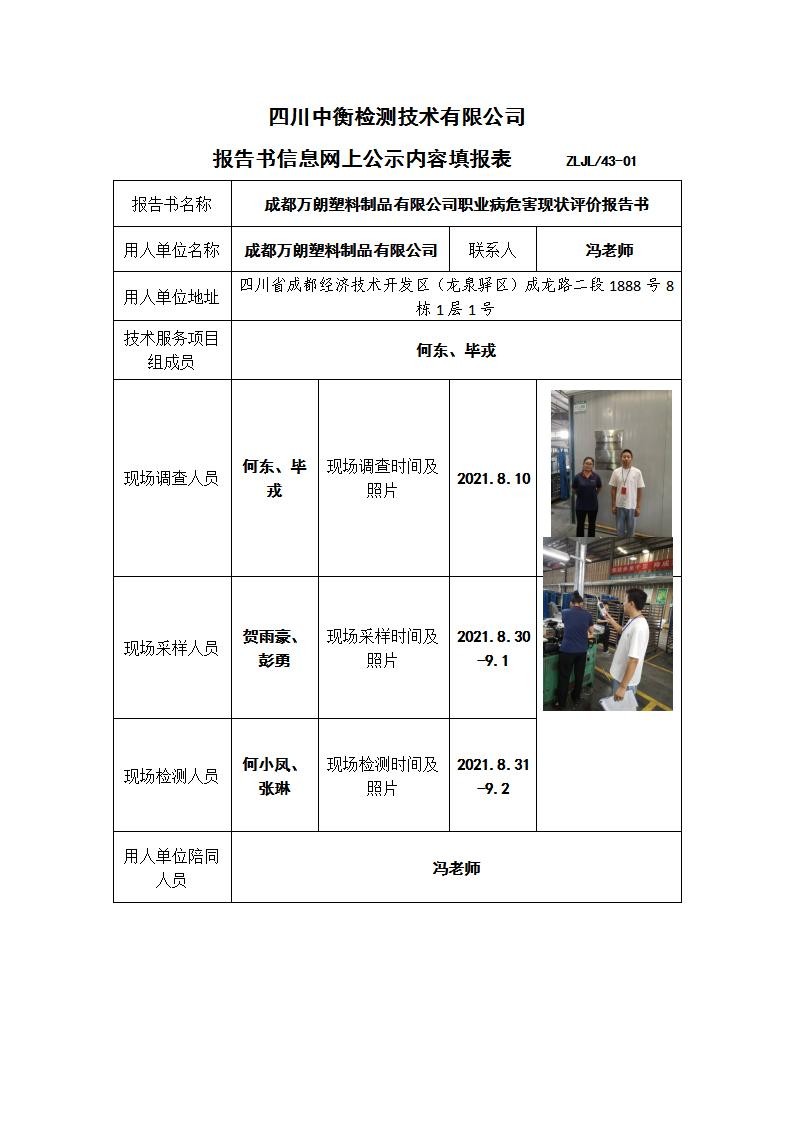 成都萬朗塑料制品有限公司職業病危害現狀評價報告書