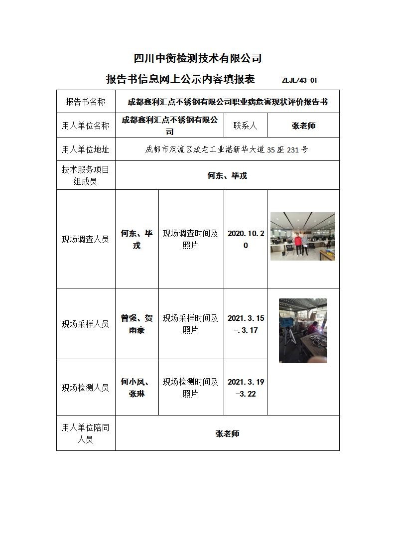 成都鑫利匯點不銹鋼有限公司職業病危害現狀評價報告書