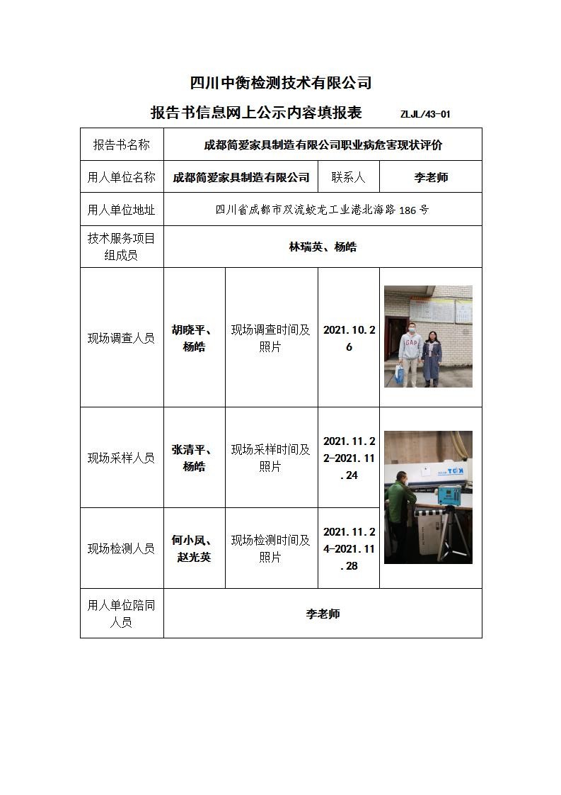 成都簡愛家具制造有限公司職業病危害現狀評價
