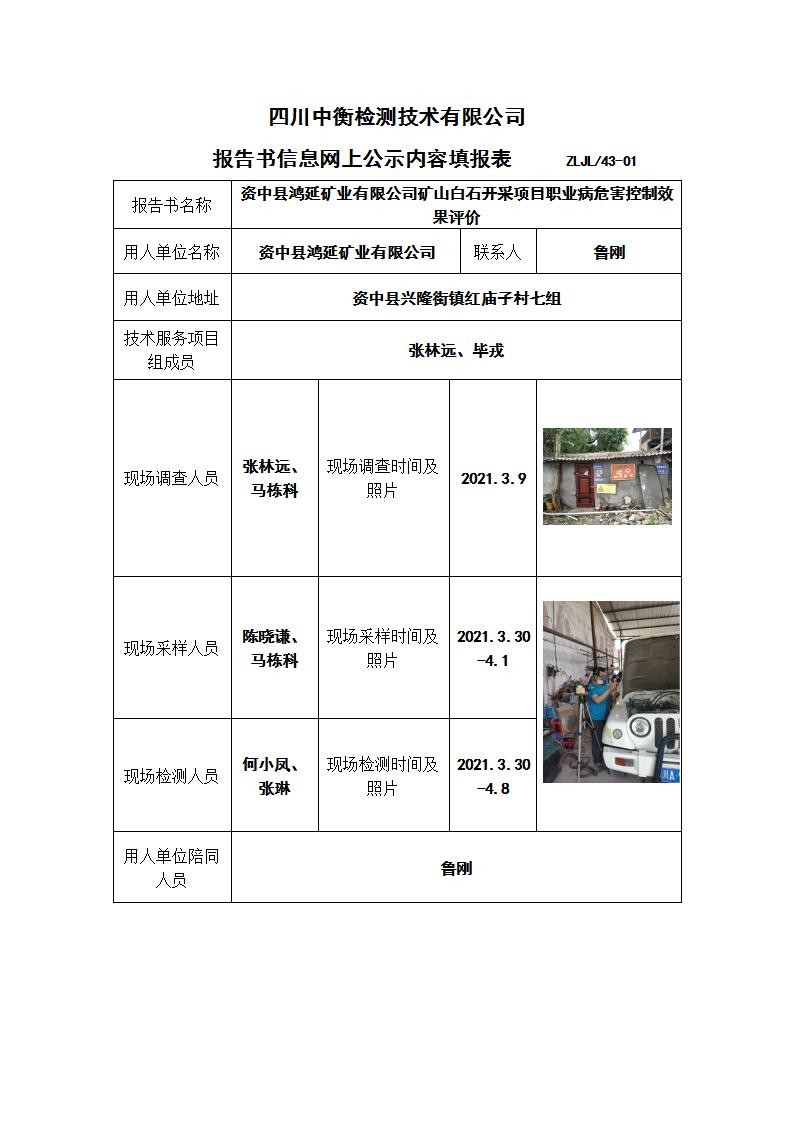 資中縣鴻延礦業有限公司礦山白石開采項目職業病危害控制效果評價