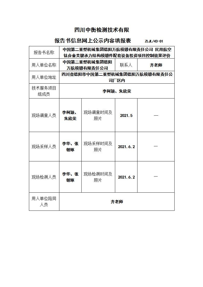 中國第二重型機械集團德陽萬航模鍛有限責任公司 民用航空鈦合金關鍵承力結構模鍛件配套設備投資項目控制效果評價