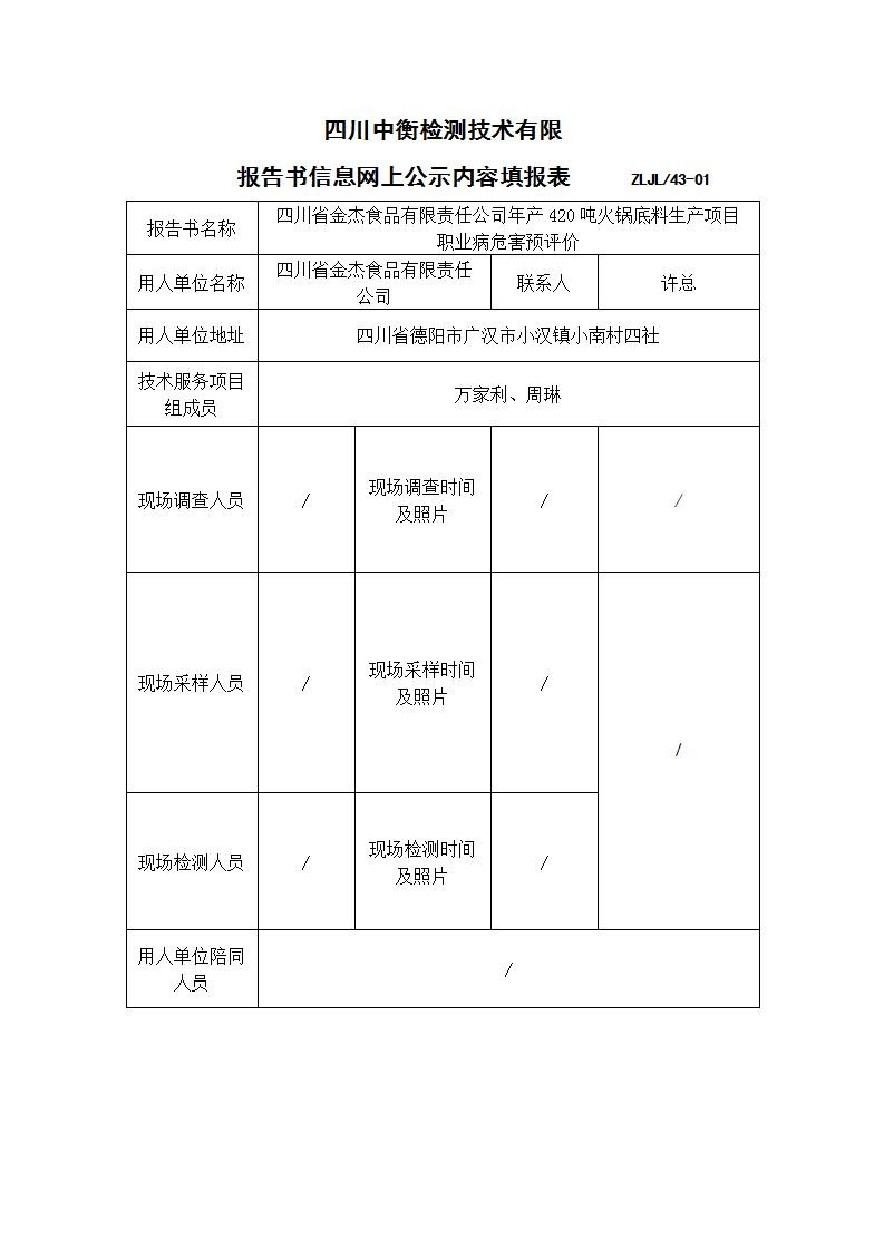 四川省金杰食品有限責任公司年產420噸火鍋底料生產項目職業病危害預評價