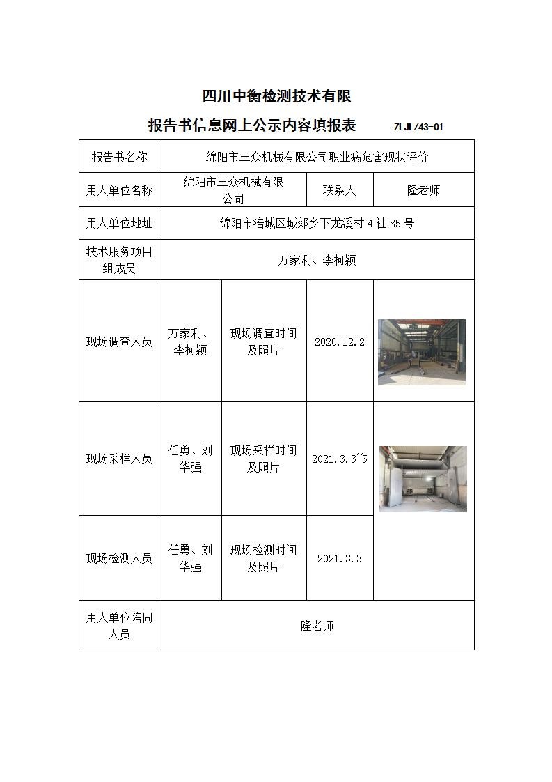 綿陽市三眾機械有限公司職業病危害現狀評價