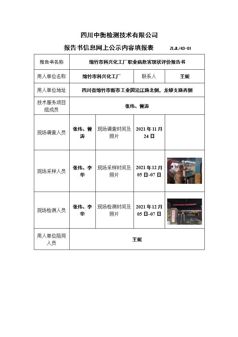 綿竹市科興化工廠職業病危害現狀評價報告書