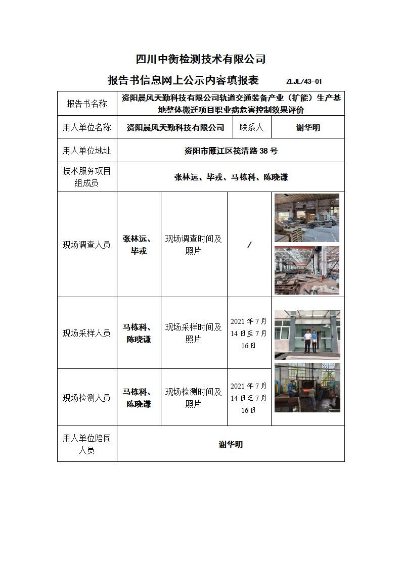 資陽晨風天勤科技有限公司軌道交通裝備產業(擴能)生產基地整體搬遷項目職業病危害控制效果評價
