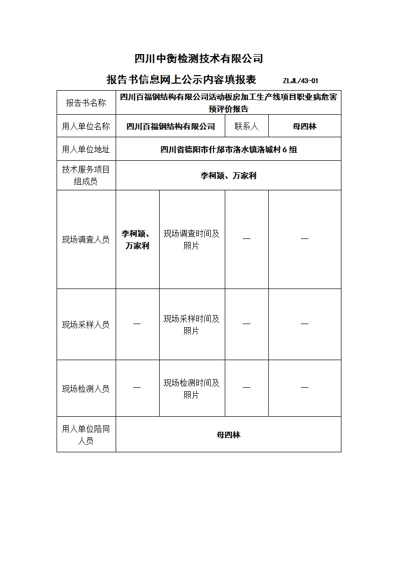 四川百福鋼結構有限公司活動板房加工生產線項目職業病危害預評價報告