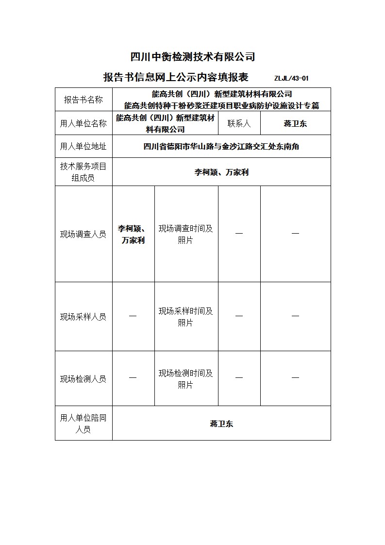 能高共創(四川)新型建筑材料有限公司 能高共創特種干粉砂漿遷建項目職業病防護設施設計專篇