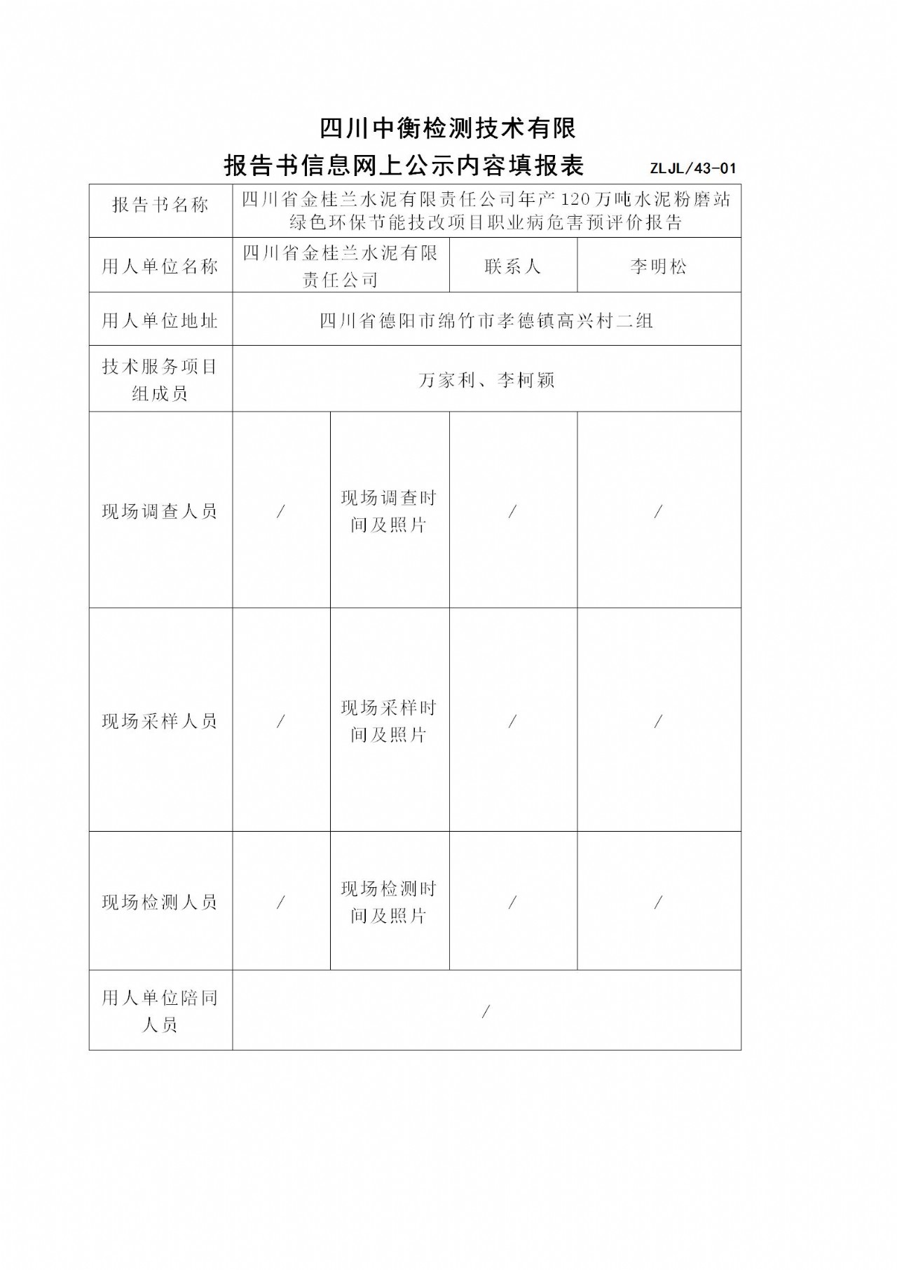 四川省金桂蘭水泥有限責任公司年產120萬噸水泥粉磨站綠色環保節能技改項目職業病危害預評價報告