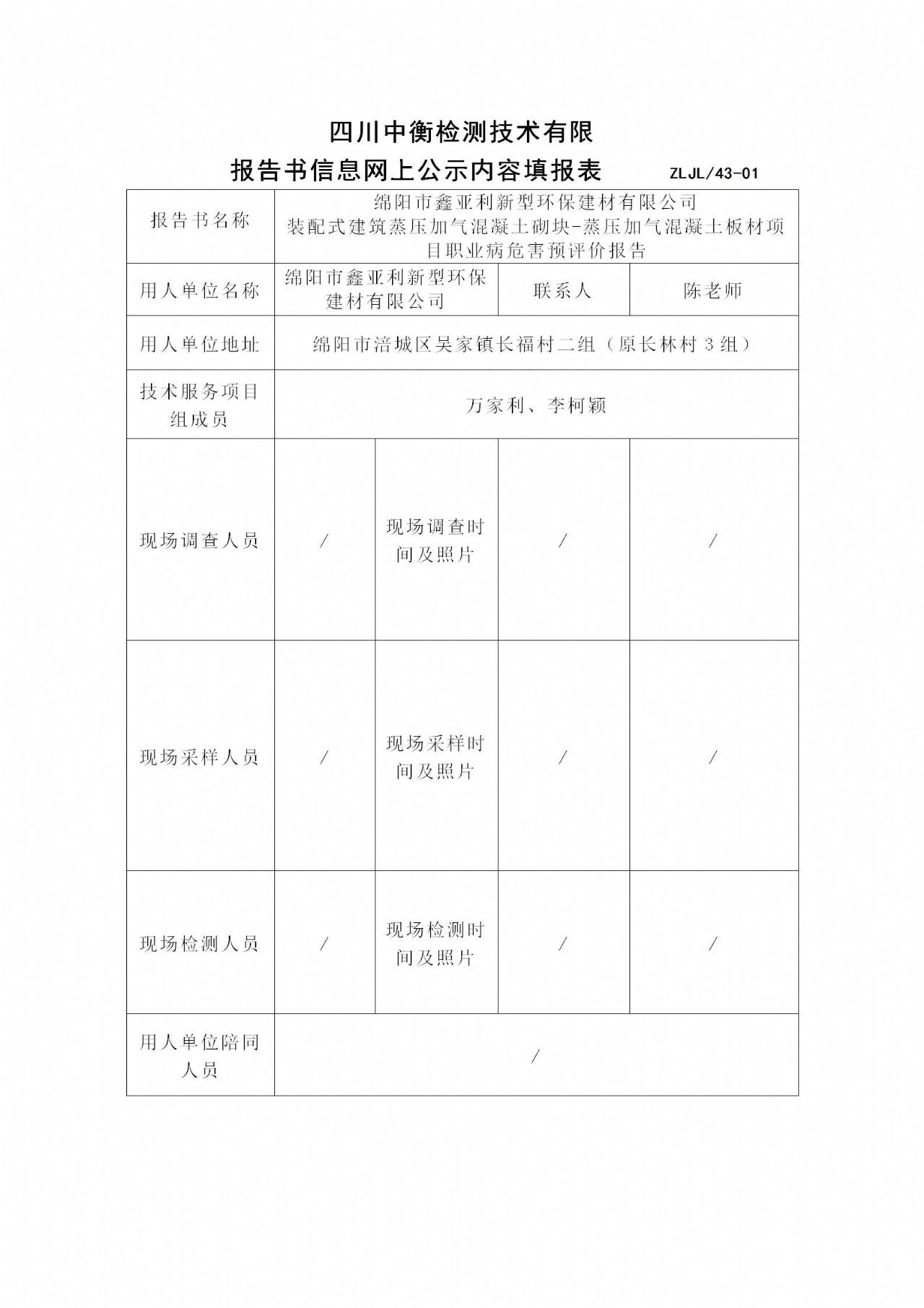 綿陽(yáng)市鑫亞利新型環(huán)保建材有限公司 裝配式建筑蒸壓加氣混凝土砌塊-蒸壓加氣混凝土板材項(xiàng)目職業(yè)病危害預(yù)評(píng)價(jià)