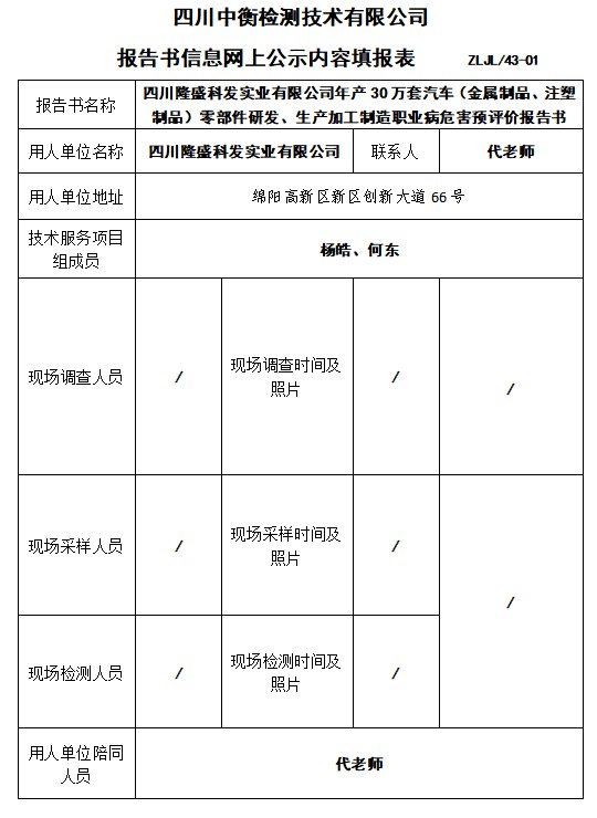 四川隆盛科發(fā)實業(yè)有限公司年產(chǎn)30萬套汽車(金屬制品、注塑制品)零部件研發(fā)、生產(chǎn)加工制造職業(yè)病危害預評價