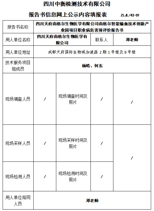 四川天府南格爾生物醫學有限公司南格爾智能輸血技術創新產業園項目職業病危害預評價