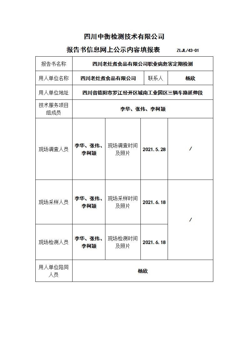 四川老灶煮食品有限公司職業(yè)病危害定期檢測