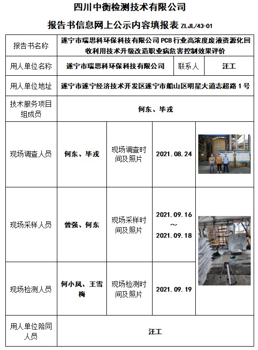 遂寧市瑞思科環保科技有限公司PCB行業高濃度廢液資源化回收利用技術升級改造職業病危害控制效果評價