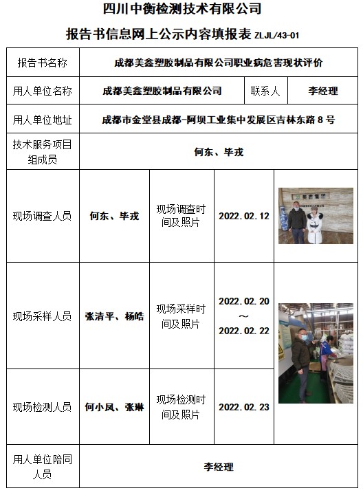 成都美鑫塑膠制品有限公司職業病危害現狀評價