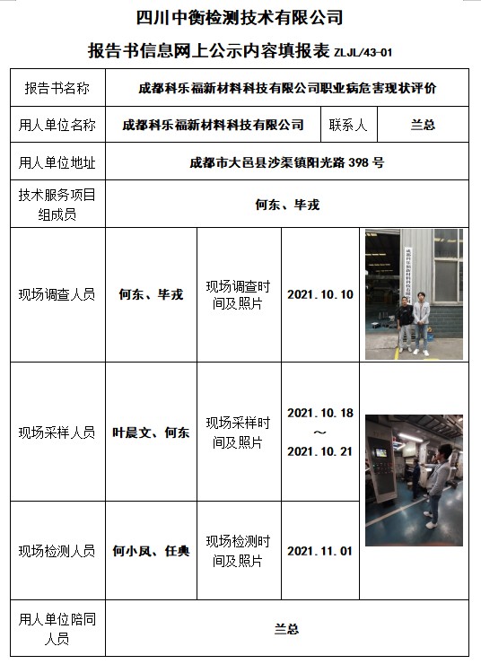 成都科樂福新材料科技有限公司職業病危害現狀評價