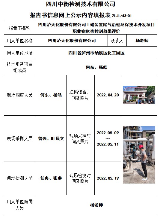 四川瀘天化股份有限公司Ⅰ硝裝置尾氣治理環保技術開發項目職業病危害控制效果評價