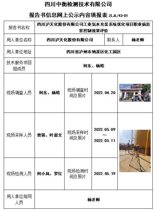 四川瀘天化股份有限公司工業氨水充裝系統優化項目職業病危害控制效果評價