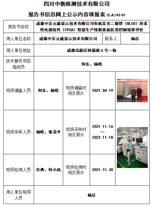 成都中京元盛顯示技術有限公司有機發光二極管(OLED)用柔性電路組件(FPCA)智能生產線職業病危害控制效果評價