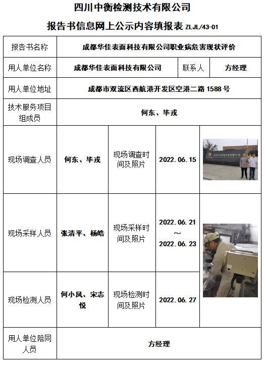 成都華佳表面科技有限公司職業病危害現狀評價