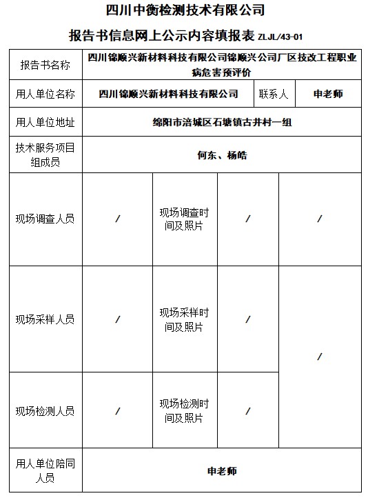 四川錦順興新材料科技有限公司錦順興公司廠區(qū)技改工程職業(yè)病危害預(yù)評價