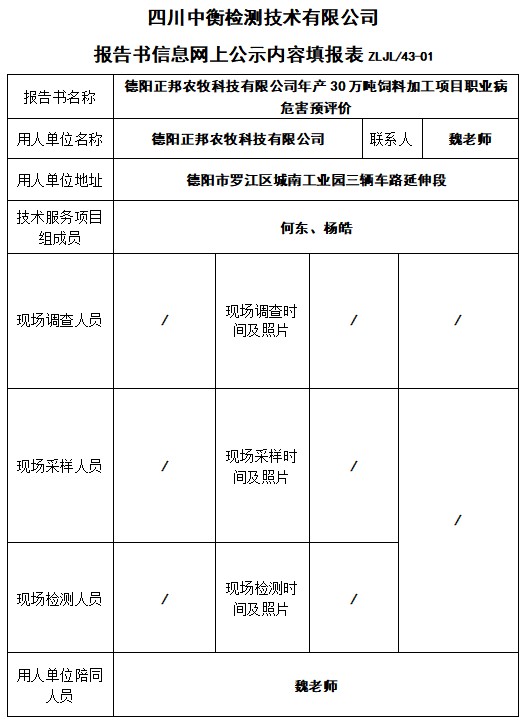 德陽正邦農(nóng)牧科技有限公司年產(chǎn)30萬噸飼料加工項(xiàng)目職業(yè)病危害預(yù)評(píng)價(jià)