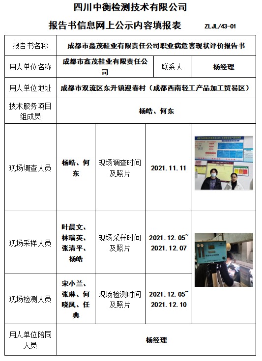 成都市鑫茂鞋業有限責任公司職業病危害現狀評價