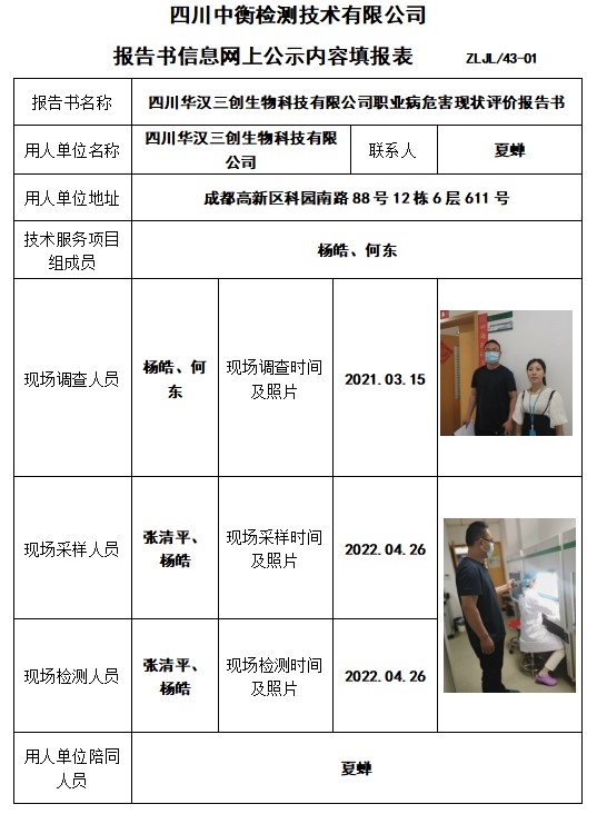 四川華漢三創生物科技有限公司職業病危害現狀評價