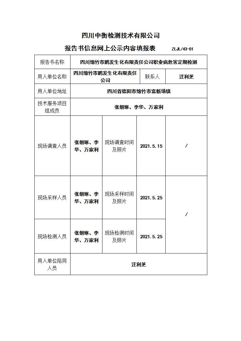 四川綿竹市鵬發生化有限責任公司定期檢測