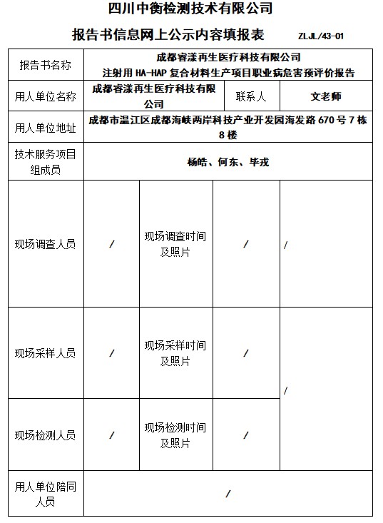 成都睿漾再生醫療科技有限公司 注射用HA-HAP復合材料生產項目職業病危害預評價