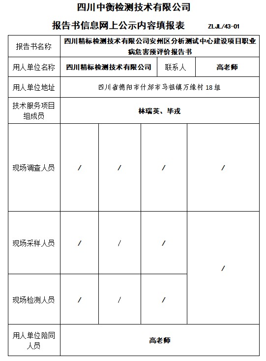 四川精標檢測技術有限公司安州區(qū)分析測試中心建設項目職業(yè)病危害預評價