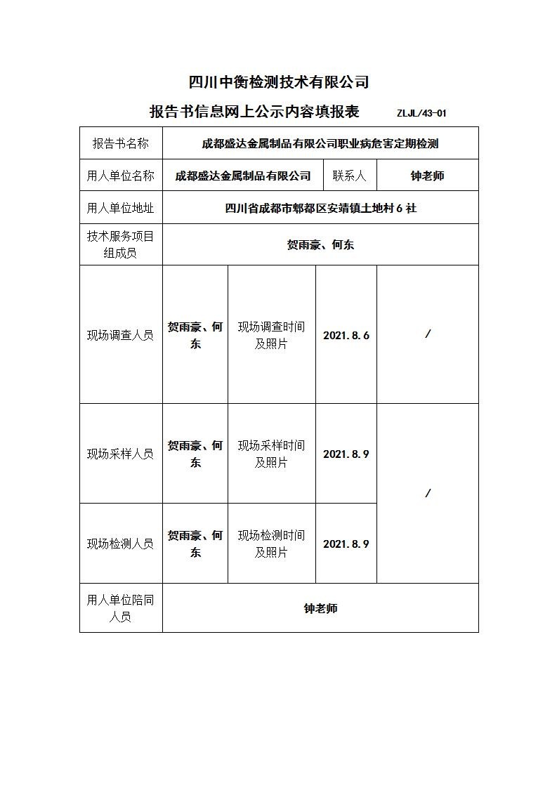 成都盛達金屬制品有限公司職業病危害定期檢測