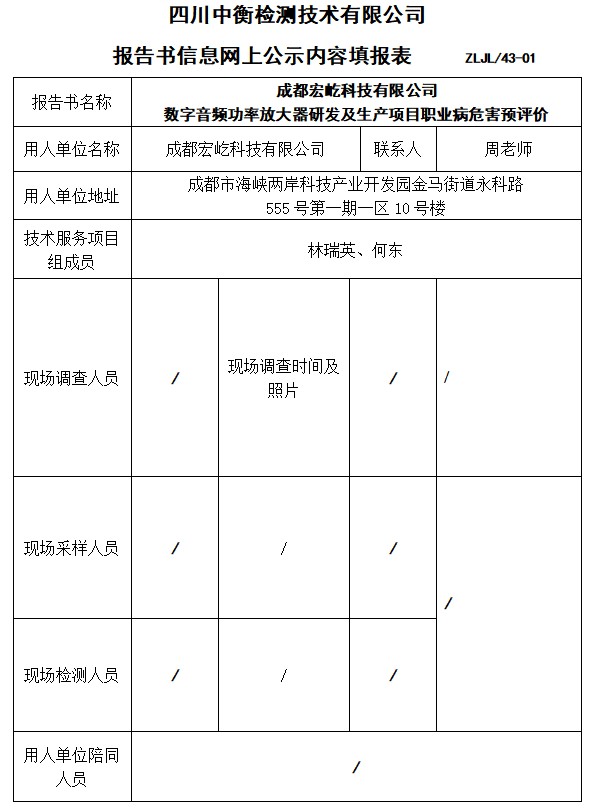 成都宏屹科技有限公司 數字音頻功率放大器研發及生產項目職業病危害預評價