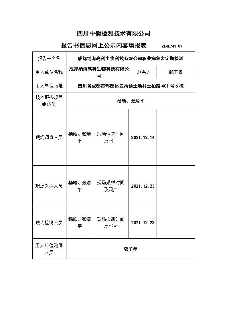 成都納海高科生物科技有限公司職業病危害定期檢測