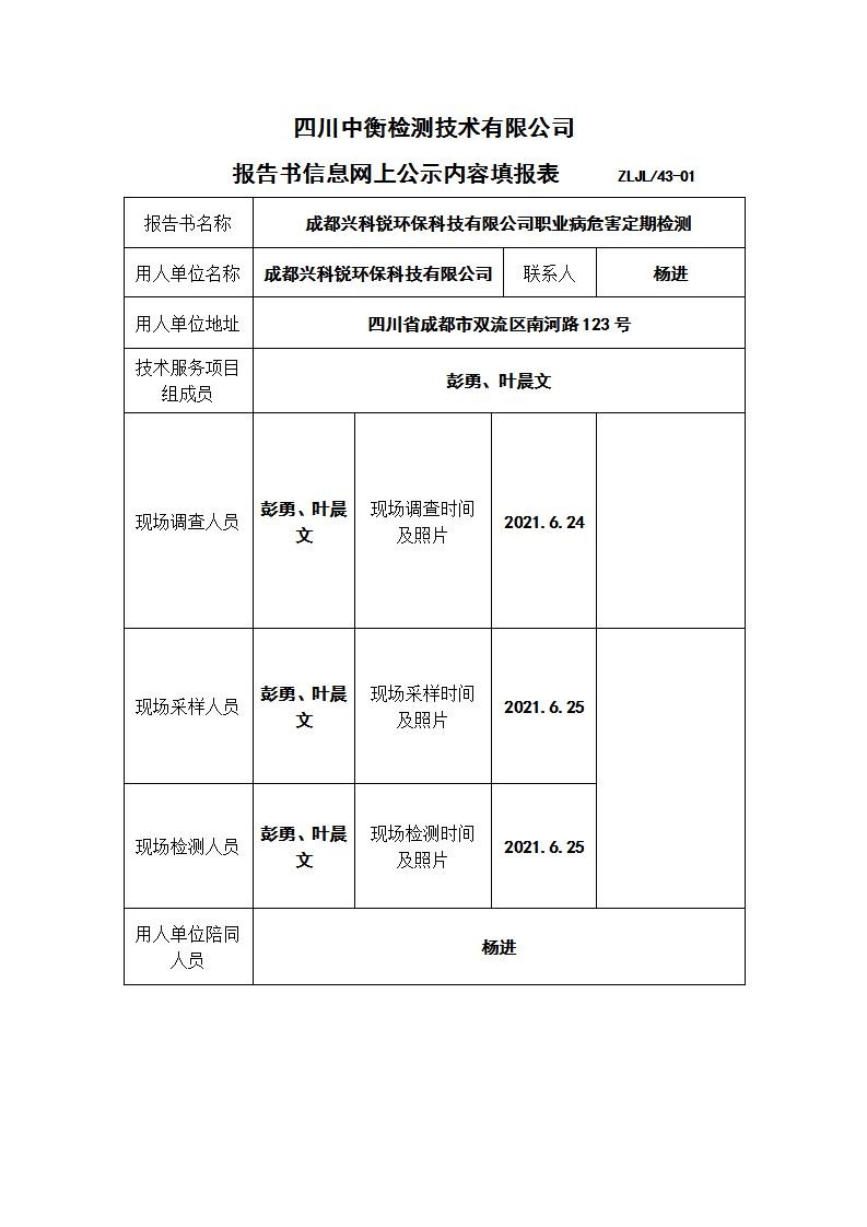 成都興科銳環保科技有限公司職業病危害定期檢測