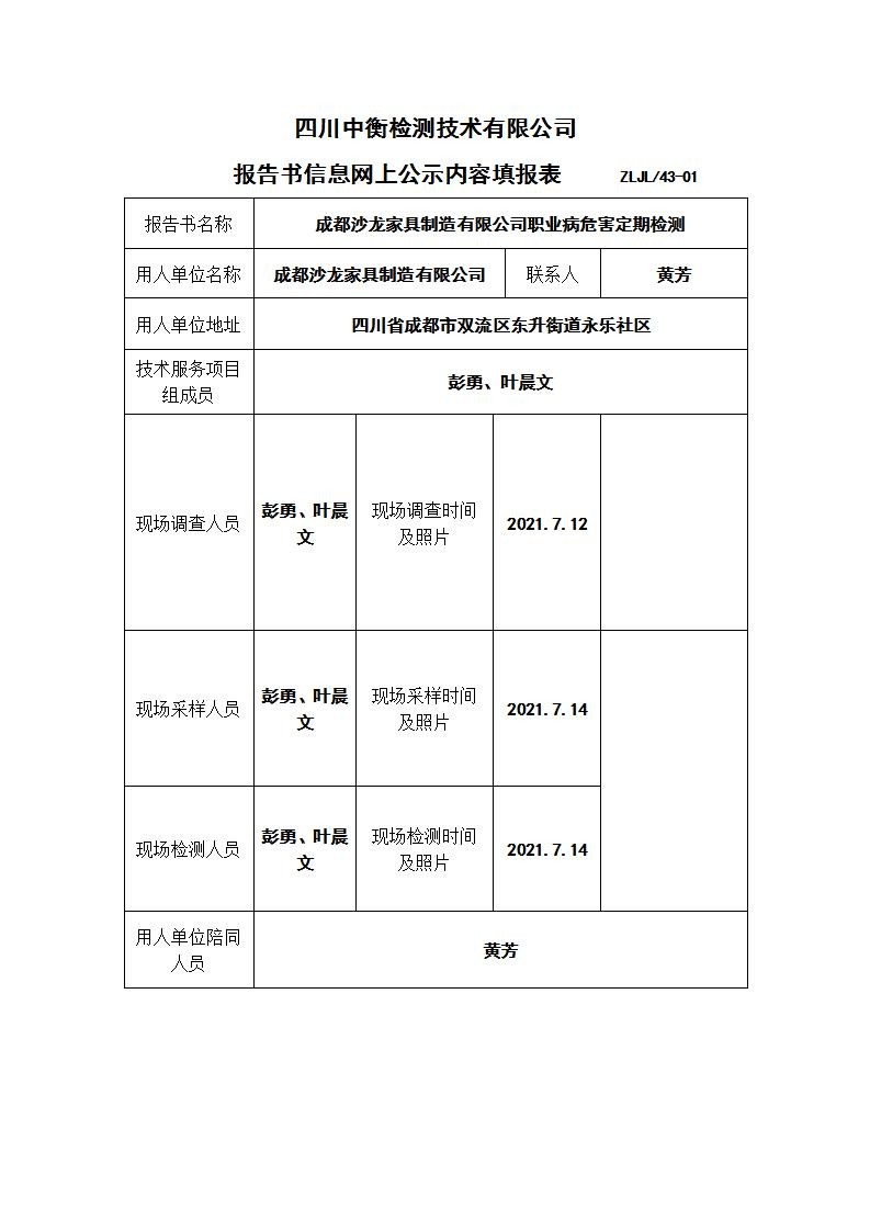 成都沙龍家具制造有限公司職業病危害定期檢測