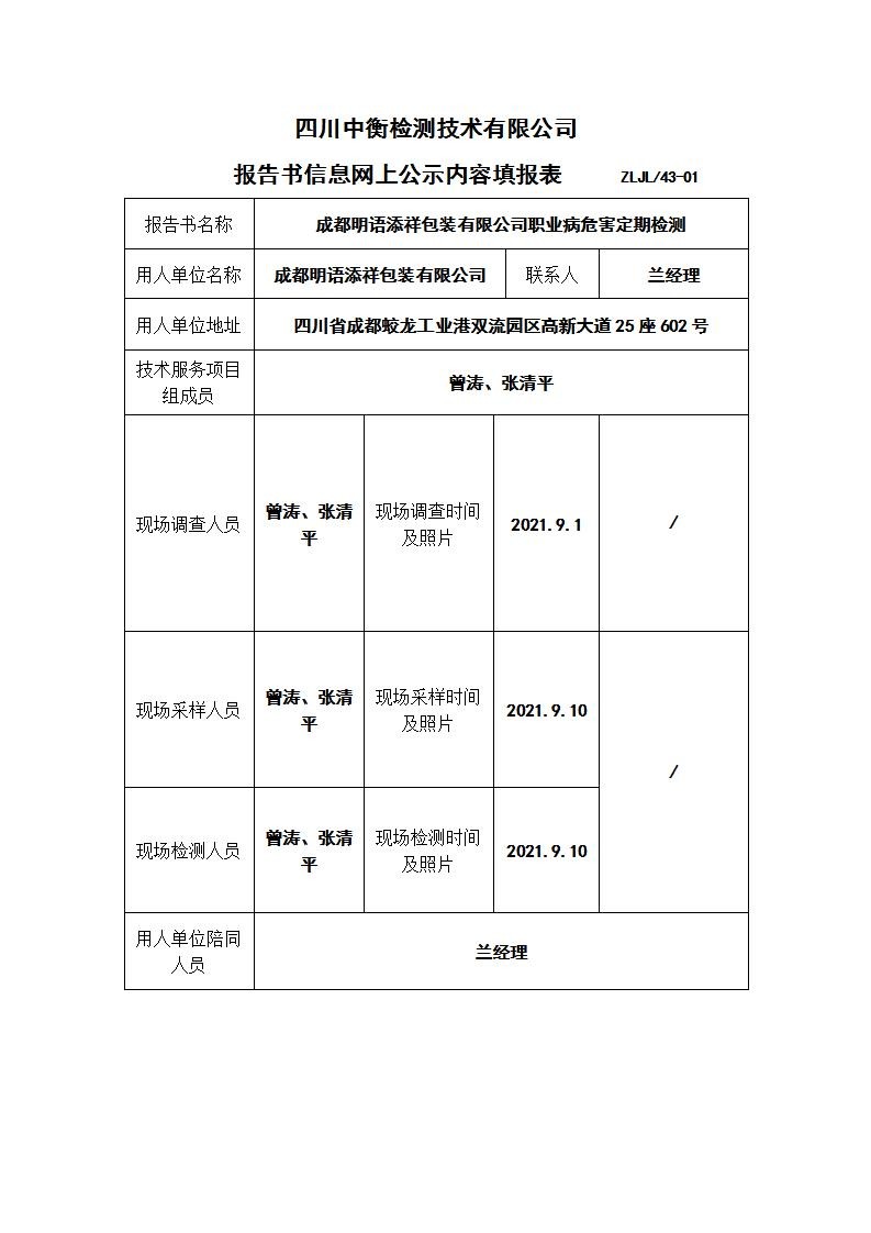 成都明語添祥包裝有限公司職業(yè)病危害定期檢測