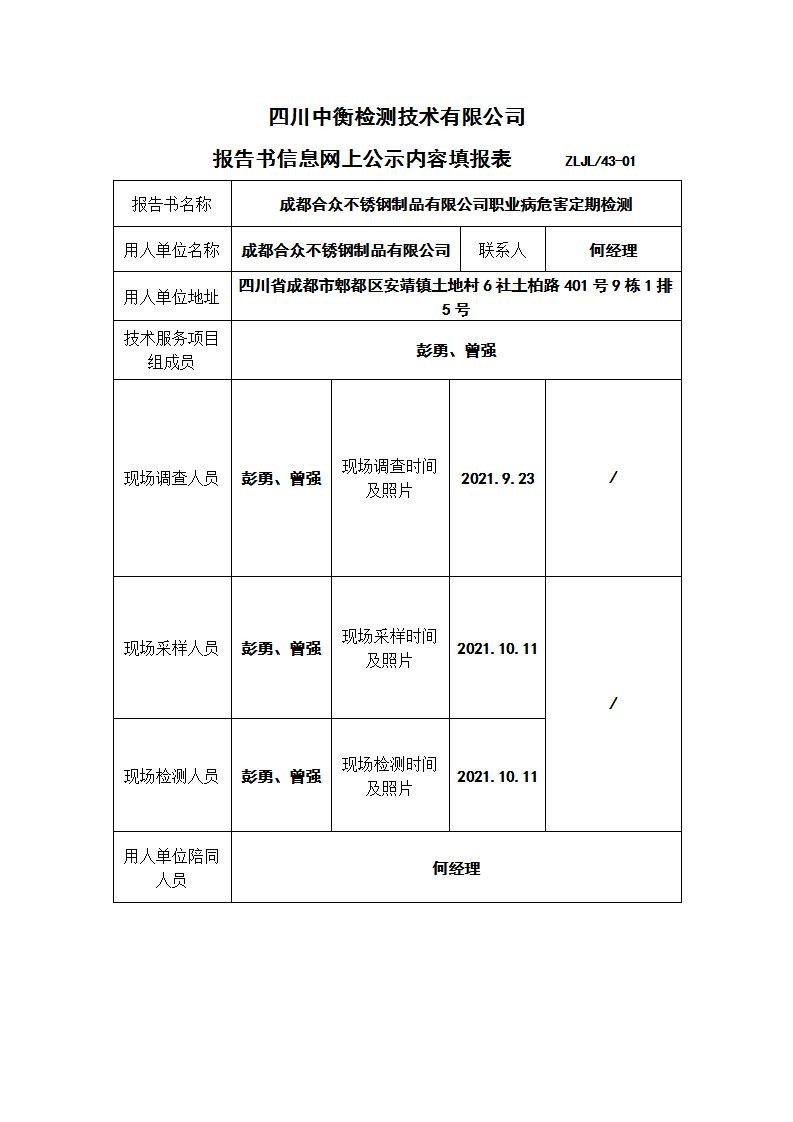 成都合眾不銹鋼制品有限公司職業病危害定期檢測