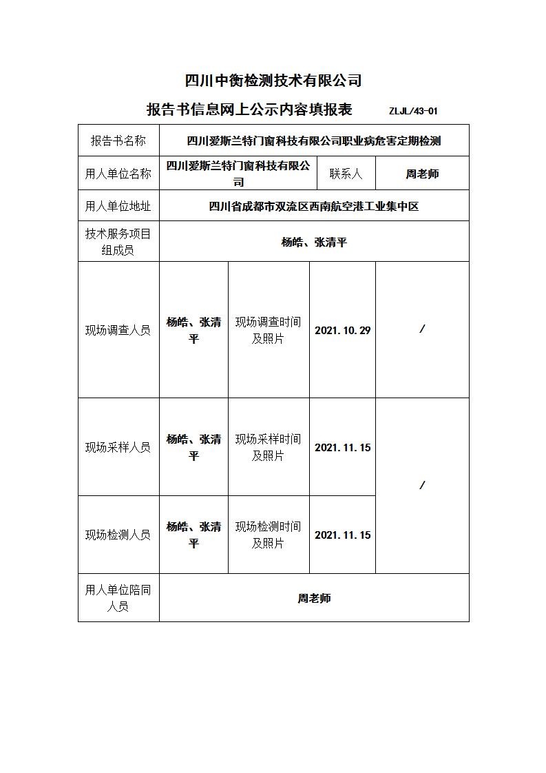 四川愛斯蘭特門窗科技有限公司職業病危害定期檢測