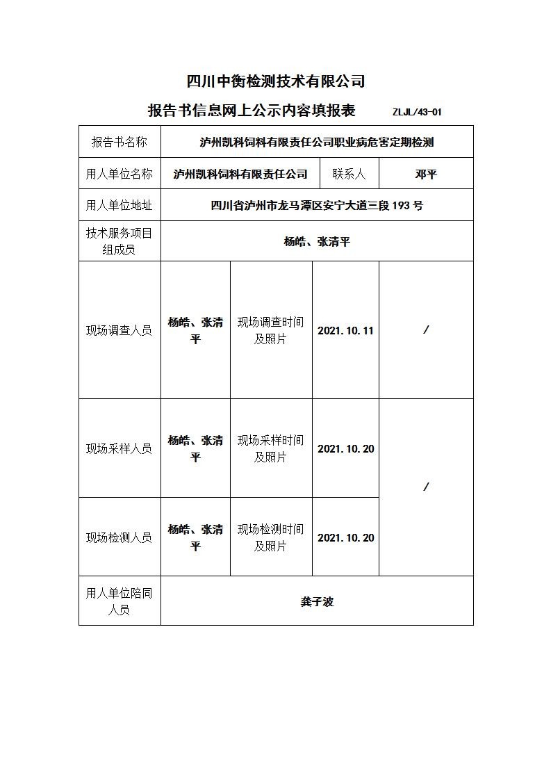 瀘州凱科飼料有限責任公司職業病危害定期檢測