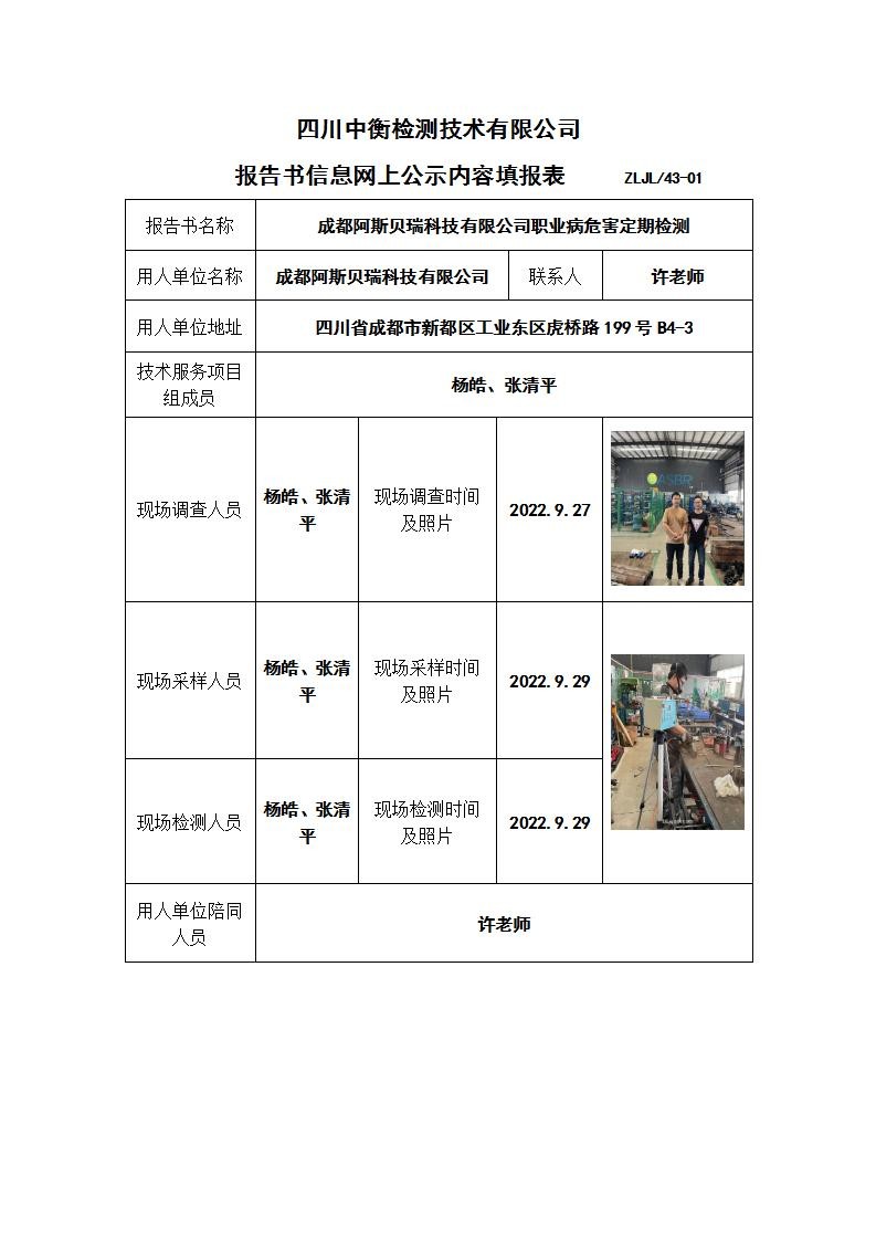 成都阿斯貝瑞科技有限公司職業病危害定期檢測