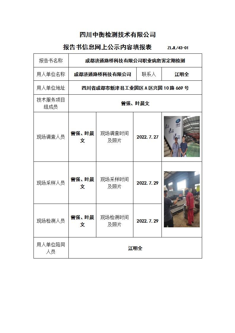 成都濟通路橋科技有限公司職業病危害定期檢測