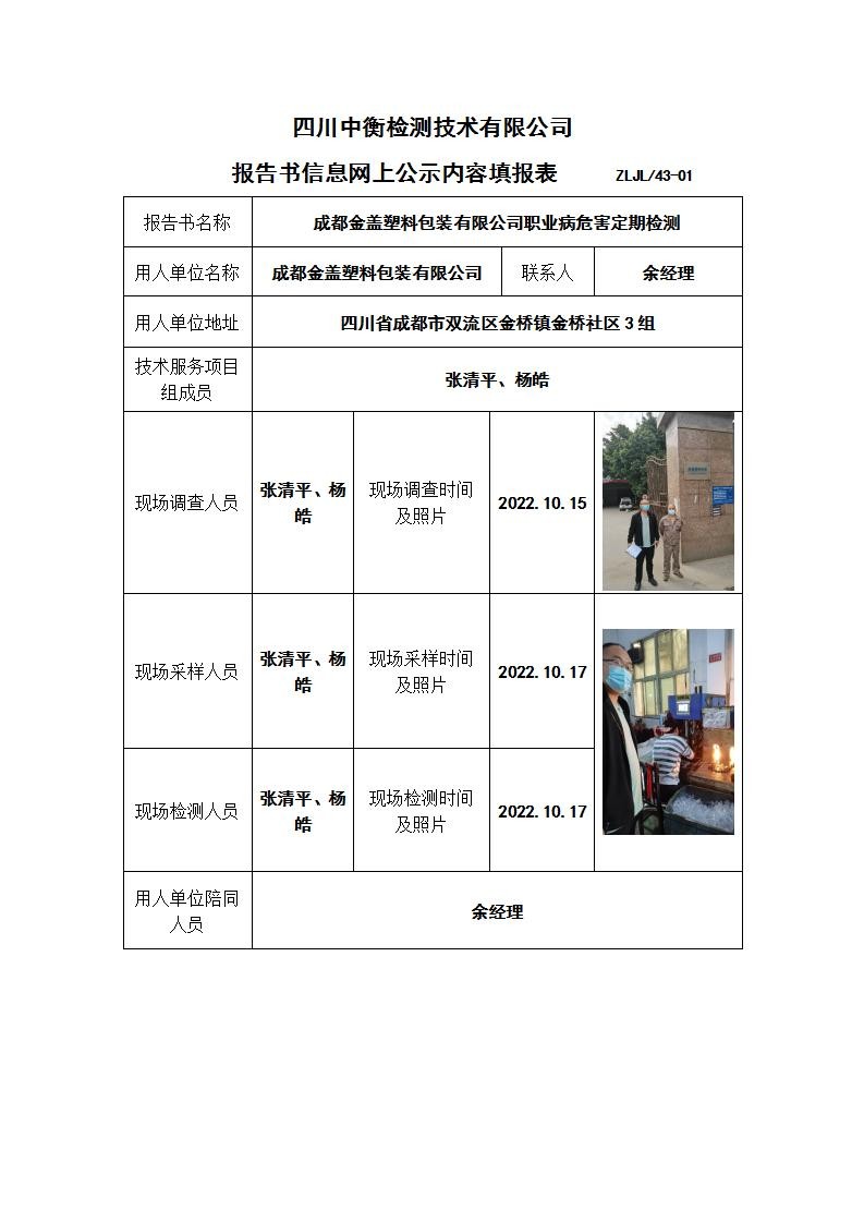 成都金蓋塑料包裝有限公司職業病危害定期檢測