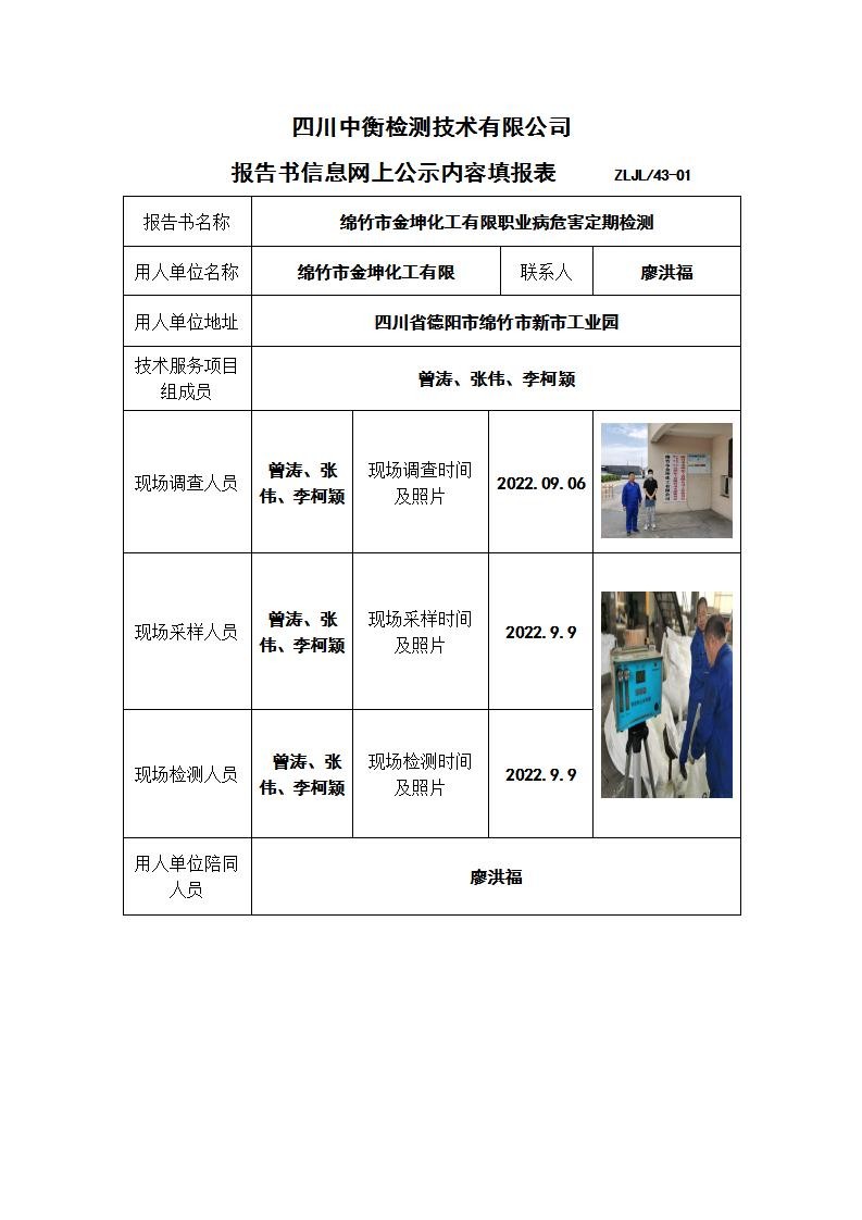 綿竹市金坤化工有限公司職業病危害定期檢測