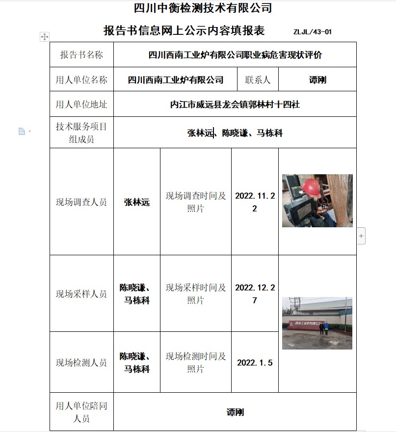 四川西南工業爐有限公司職業病危害現狀評價