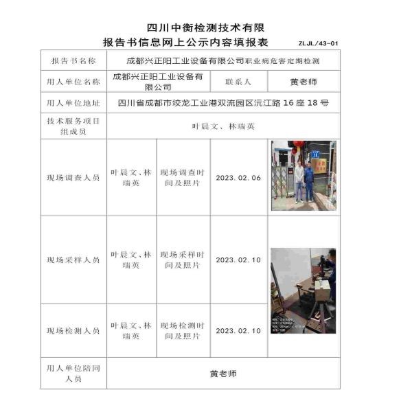 成都興正陽工業設備有限公司職業病危害定期檢測